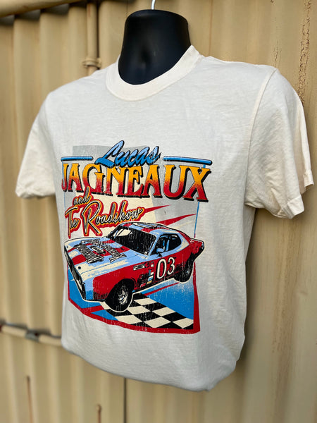 Comfort Color Oversized T-Shirt. Off White with multi color race car logo.